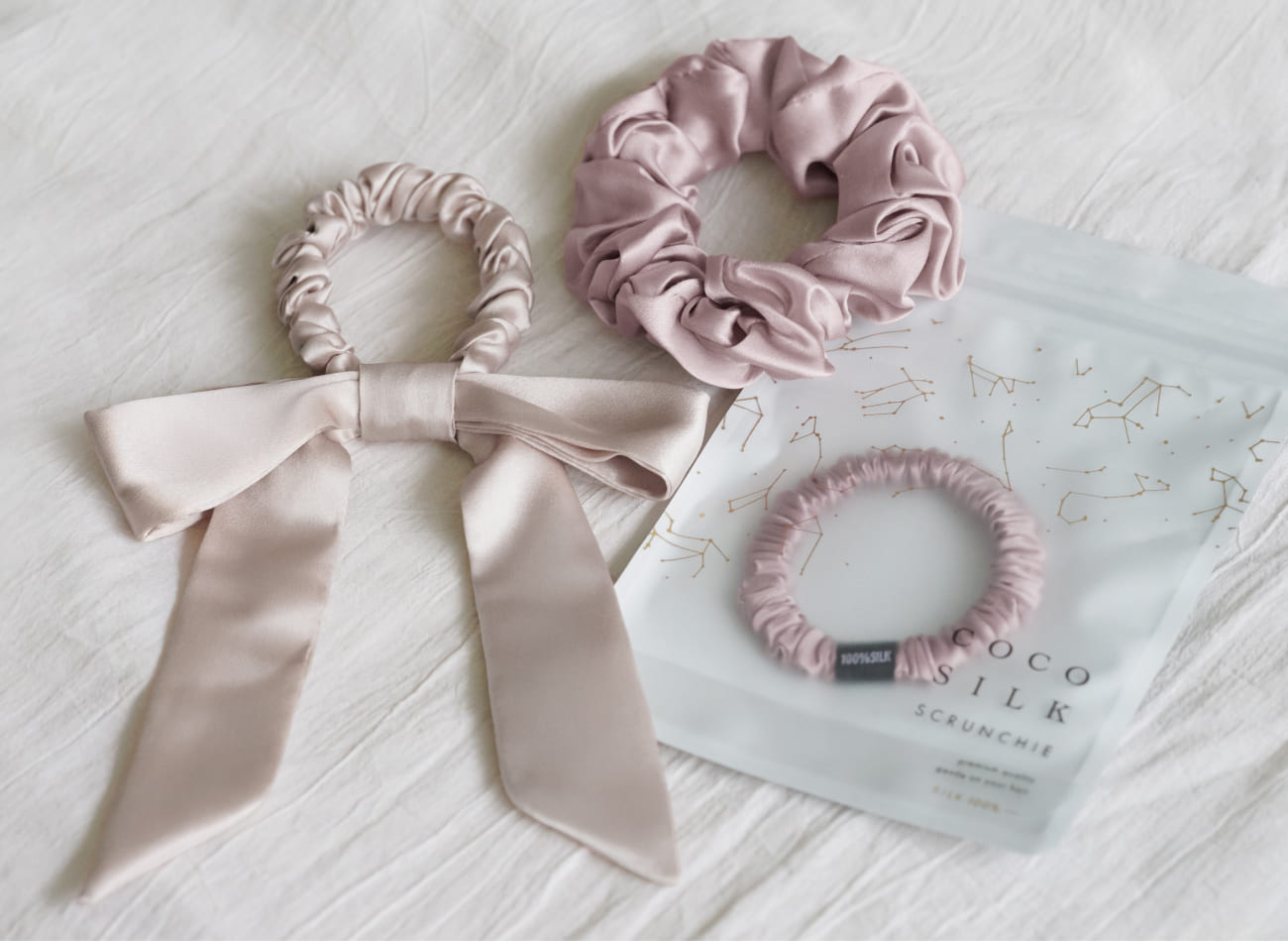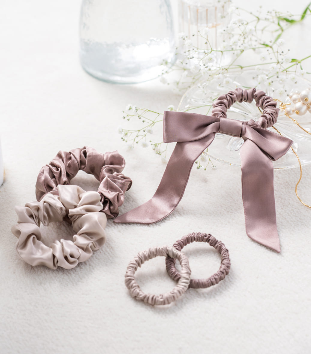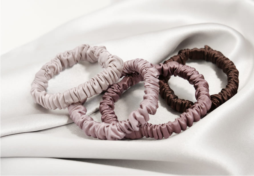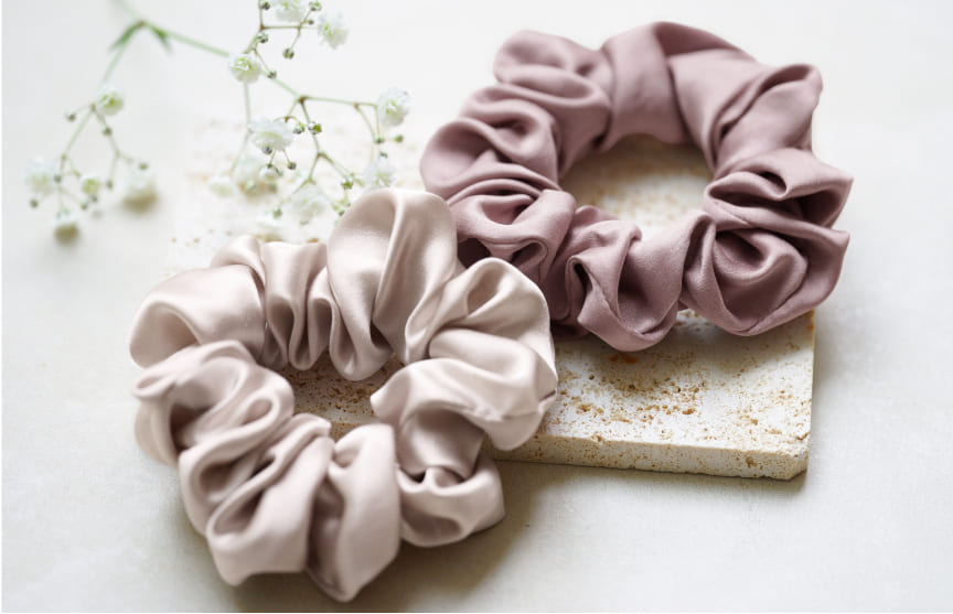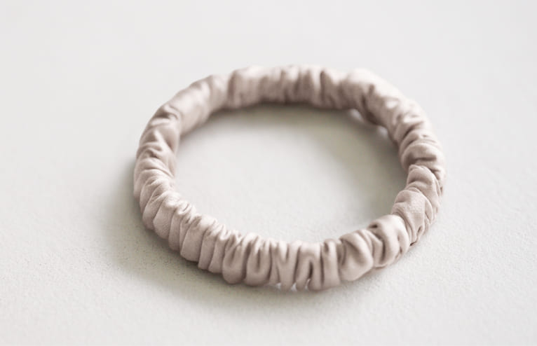 髪だけでなく肌にもやさしいシルク。使わない時は腕につけることが多いシュシュ・ヘアゴムも、なめらかで気持ちのいい肌当たりです。