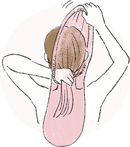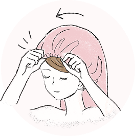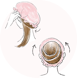片手でヘアケアキャップを持ち、反対の手で髪の毛をまとめます。